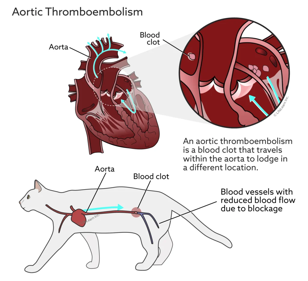 Affected cats often have underlying heart disease called hypertrophic cardiomyopathy, in which the heart muscle thickens and loses function. The lower heart chambers (ventricles) decrease in size and contracting ability (see handout “Cardiomyopathy in Cats” for further information on this type of heart disease). Blood flow through the heart is compromised, and clots can form that later become dislodged into the aorta.