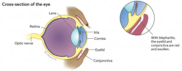 The skin covering the eyelids may have dry crusts or flakes on its surface and small papules or pustules (pimples) may develop on the surface. The papules, pustules, and crusts may be single or multiple. One or more meibomian glands (glands that help lubricate the eyes) along the margin of the eyelid may become swollen. In more severe cases, the inflammation may spread and include conjunctivitis (inflammation of the conjunctiva) or keratitis (inflammation of the cornea).