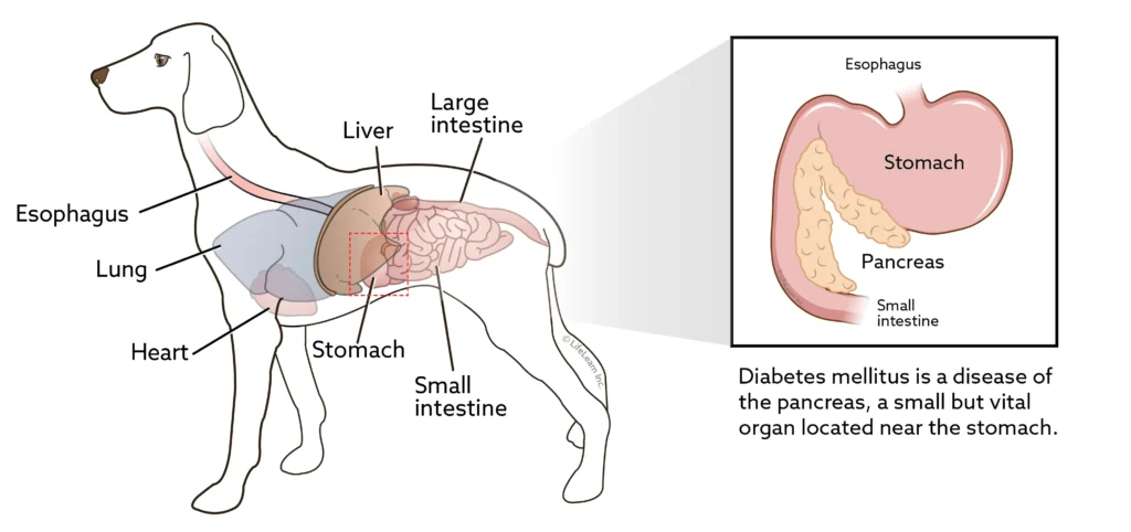 In dogs, diabetes mellitus is caused by the failure of the pancreas to produce enough insulin to regulate blood sugar. This is insulin-dependent diabetes mellitus (also called Type 1 Diabetes). This type of diabetes usually results from destruction of most or all beta-cells that produce insulin in the pancreas. As the name implies, dogs with this type of diabetes require insulin injections to stabilize blood sugar levels.