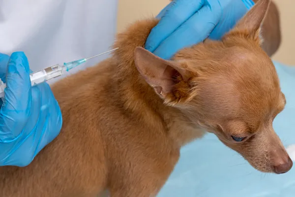 3. Quickly push the sharp, thin needle through your dog’s skin at about a 45-degree angle into the space or “tent” produced by lifting the skin and push the syringe plunger all the way into the syringe barrel.