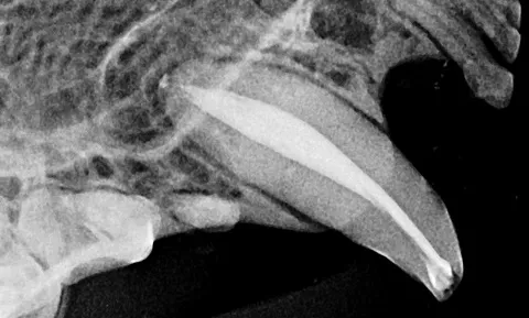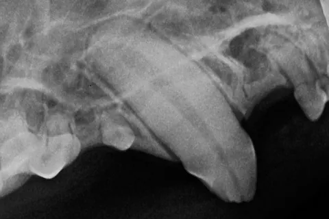 Fig. 2: X-ray showing a cat’s exposed root canal before therapy.