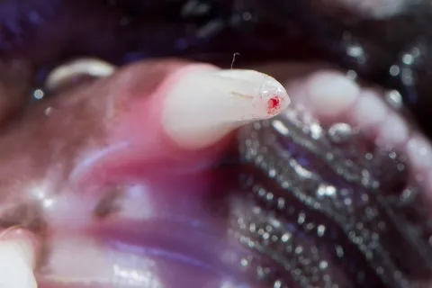Fig. 1: Fractured upper canine tooth in a cat.When a cat breaks a tooth and exposes the pulp, bacteria and oral debris enter the tooth. As a result, a painful inflammation of the pulp (pulpitis) develops, eventually causing the nerves and blood vessels to die. The bacteria then move out of the bottom of the root (the root apex) and infect the bone surrounding the root (called apical periodontitis).