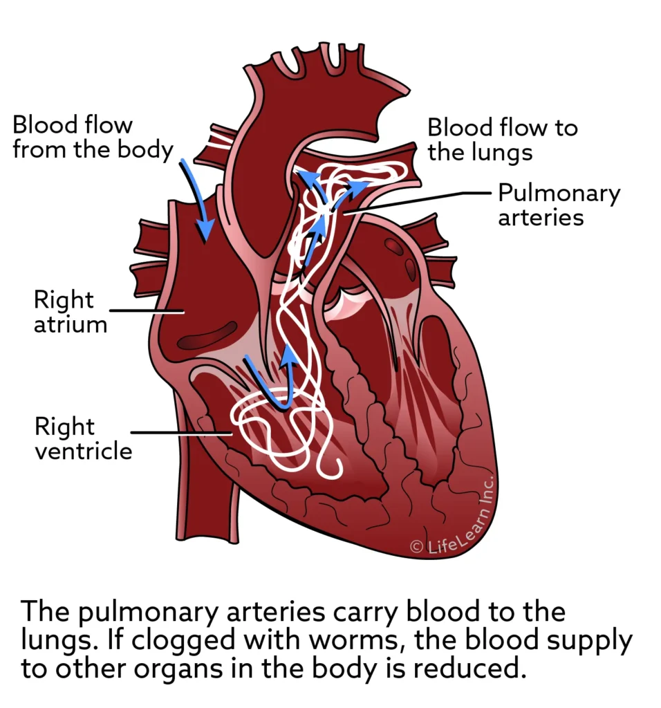 Adult heartworms cause heartworm disease through their effect on the heart and blood vessels that lead from the heart to the lungs (pulmonary arteries). They cause chronic inflammation that leads to scarring and narrowing of the pulmonary arteries and thickening (fibrosis) of the surrounding lung tissue. These irreversible changes cause pulmonary hypertension (increased blood pressure in the vessels of the lungs), which means the heart has to work harder to pump blood to the lungs for oxygen.