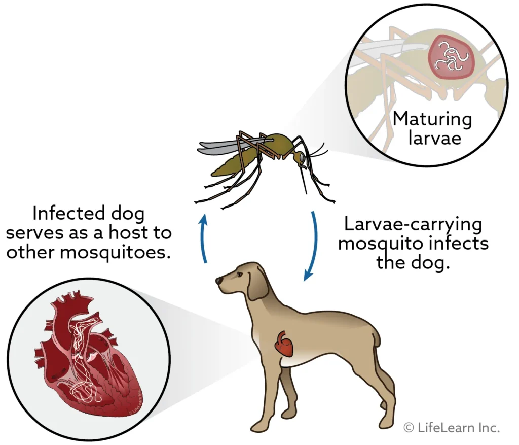 Since transmission requires the mosquito as an intermediate host, the disease is not spread directly from dog to dog. The spread of the disease, therefore, coincides with mosquito season, which can last year-round in many parts of the United States. The number of dogs infected and the length of the mosquito season are directly correlated with the incidence of heartworm disease in any given area.