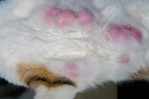 In mild or early cases of mastitis, the first sign of a problem may be that the nursing kittens are not gaining weight as quickly as expected. Careful examination may reveal slight swelling or inflammation of the affected mammary gland. In these stages, the affected cat often does not show any signs of illness and may show only minimal discomfort.