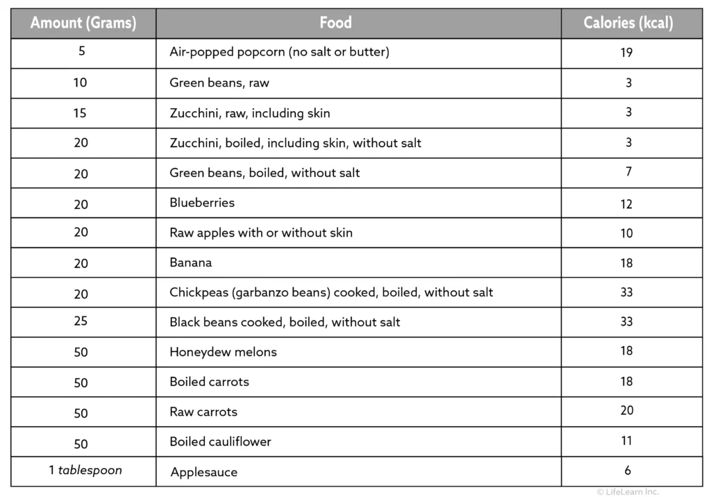 Below is a table of fruit and vegetable ingredients that may be given as treats for dogs, with appropriate amounts and calories (kcal) they provide.
